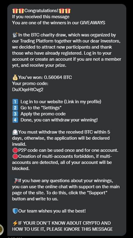 So this was an interesting journey, and it does give you an insight into why scams work. Scammers know that people generally are motivated by greed or financial gain. So anything with the promise of "free money" will almost always net a few victims. Heck I even got a bit carried away, knowing full well the risks at play (and a small part of me even believed that this may have been real). If you do see some offer of "free money", especially if it is a significant amount, be very wary and try err on the side of caution and simply ignore it. Lastly, if you wish to dabble in cryptocurrency, stick with the well known and reputable exchanges such as: