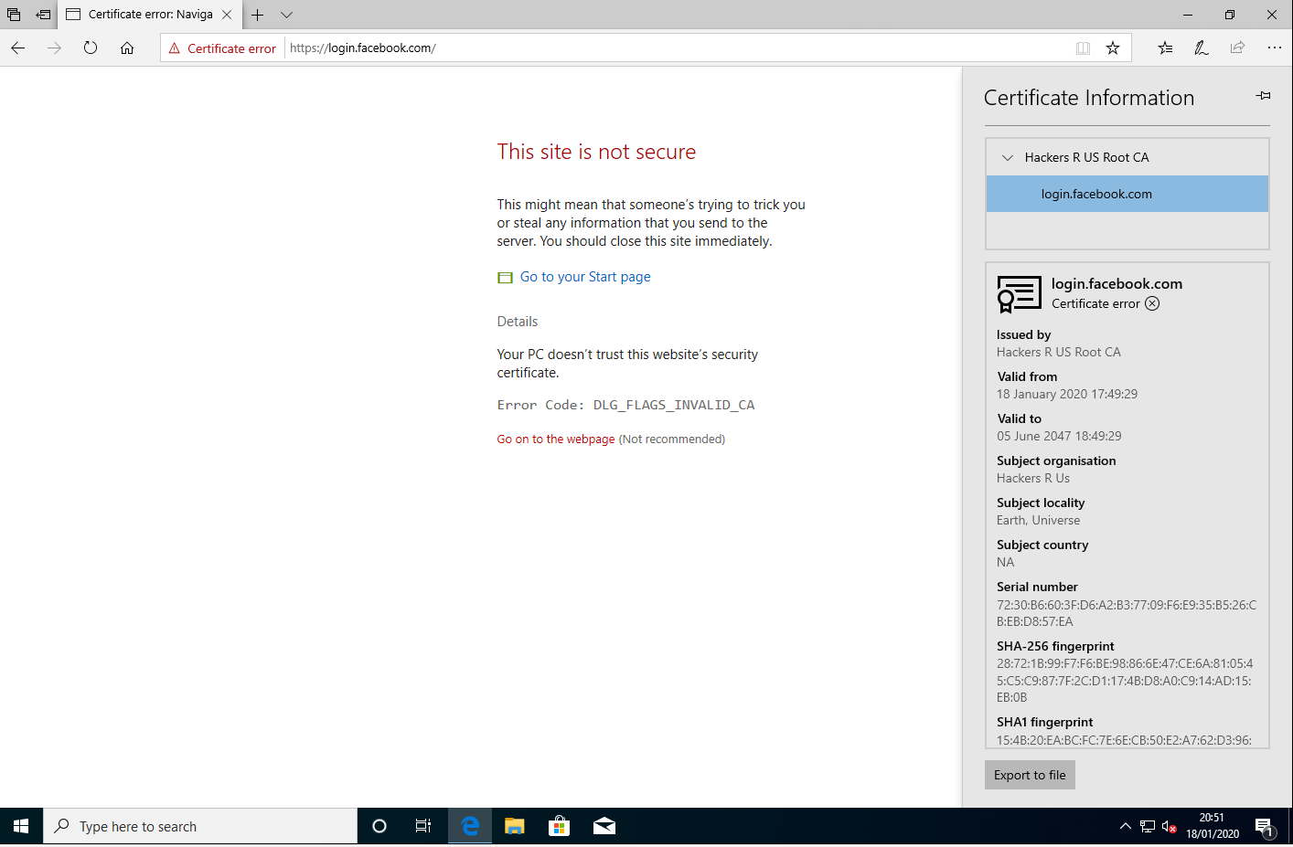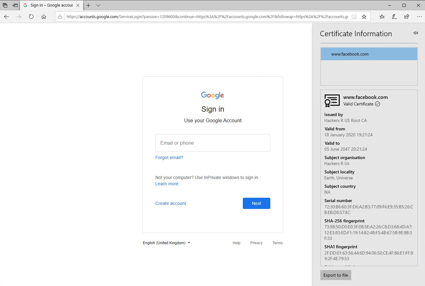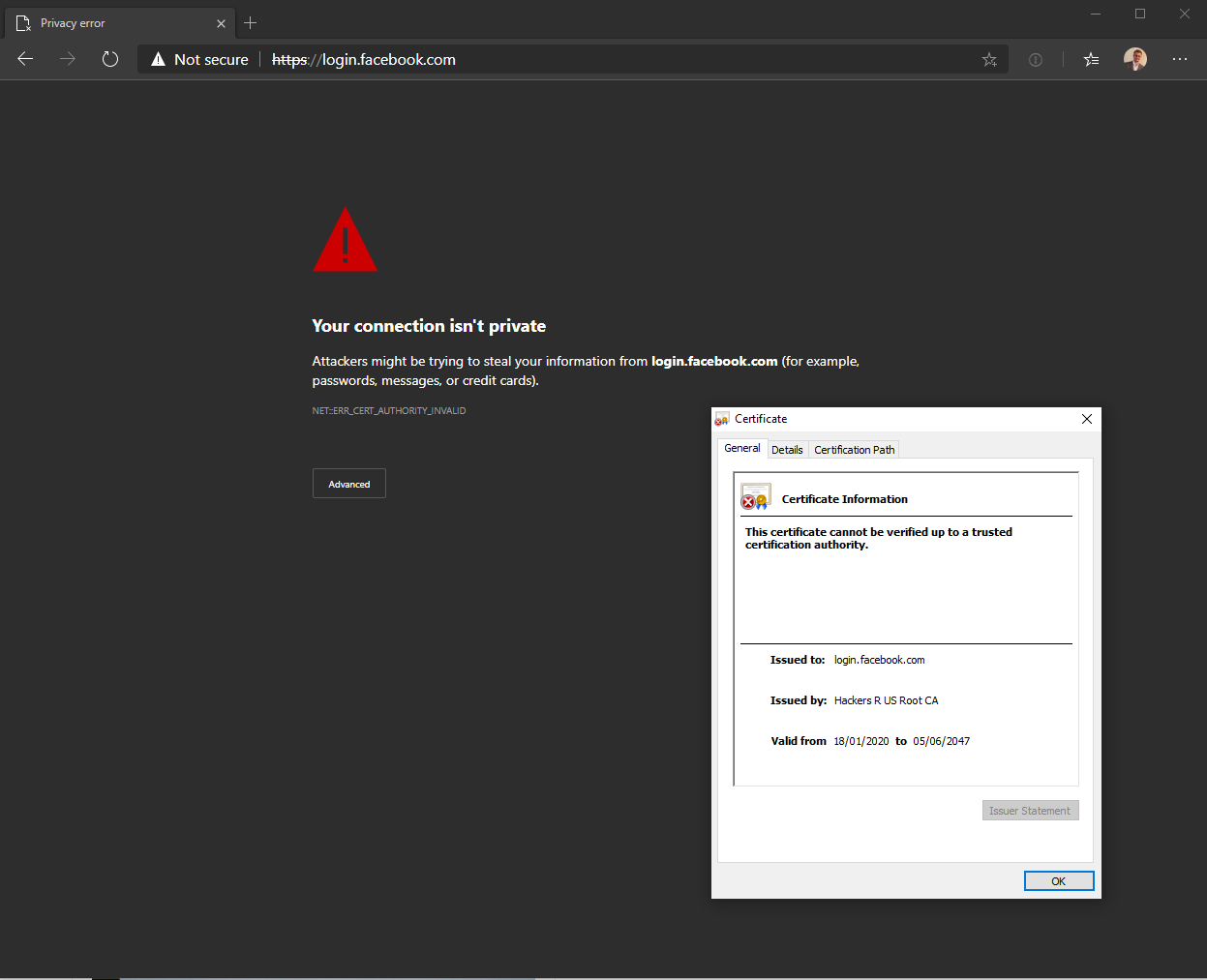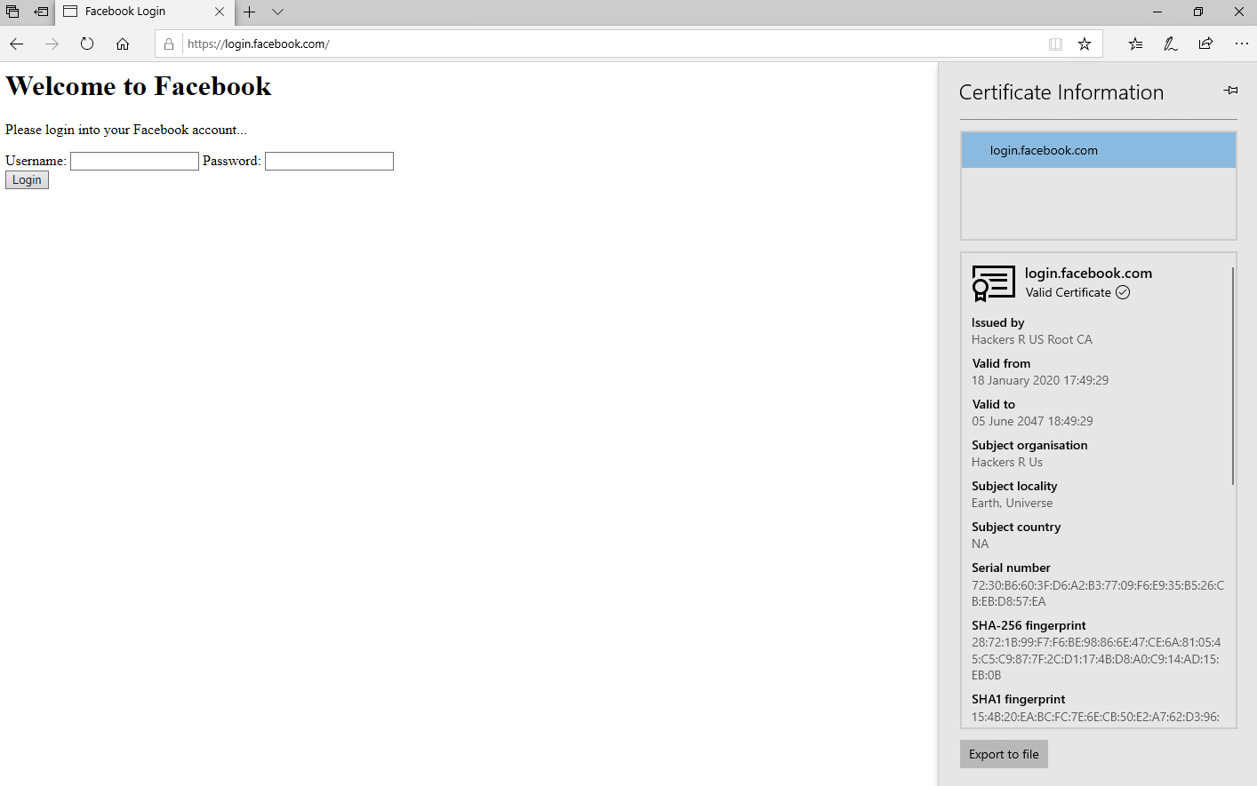 The first illustration will be a rogue service. For this I will setup a simple spoofed login page for Facebook. I purposely made it a VERY bad and horrible spoof, just to help emphasize the point that this is not a legitimate page, as well as not being the point of this example. Attackers would typically take great effort to make as indistinguishable from the real login page as possible. I'm merely trying to show that IE and Edge on vulnerable systems would show the certificate being valid for an obviously illegitimate site.