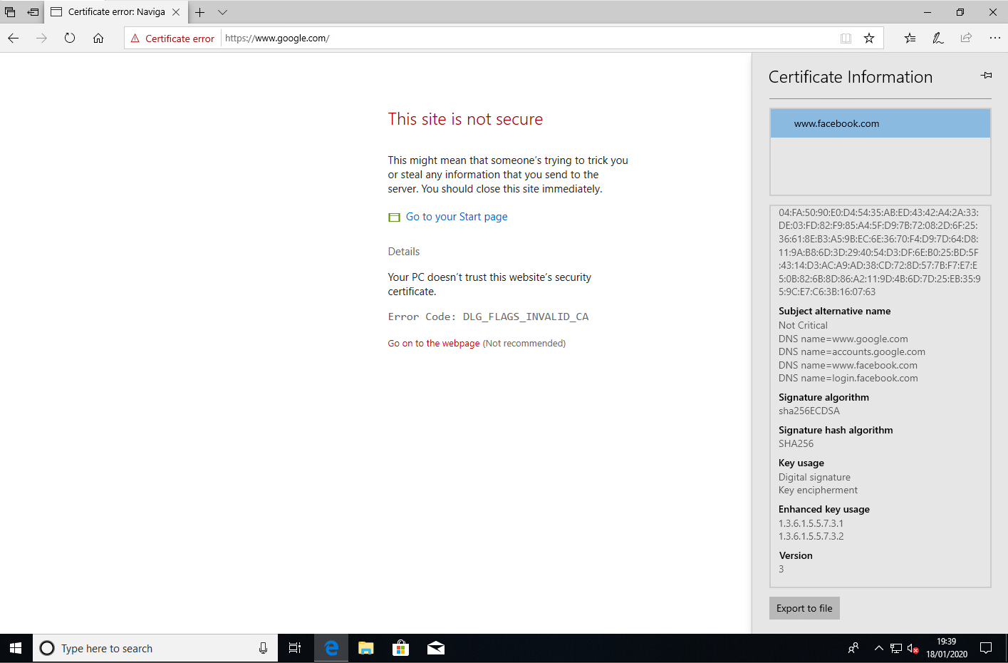 For the other illustration, I attempted to perform a Man in The Middle attack, illustrating how IE on the vulnerable system will trust the "invalid" certificate.