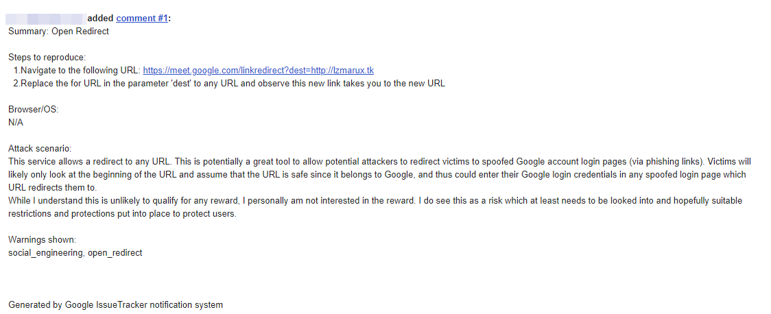 Another point is the additional query parameters. There are additional query parameters which do get generated in this link when it is created in Google Meet, however this vulnerability works without those parameters. What is worse you can provide any parameters and they are simply ignored. Now this is an issue because you can use this to help mask the redirect URL: