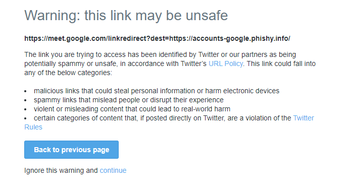 Yet when you post the link in something like Twitter and attempt to access the link you are prompted with a warning (kudos to Twitter on this, they've done a great job on this and this is a really great feature):
