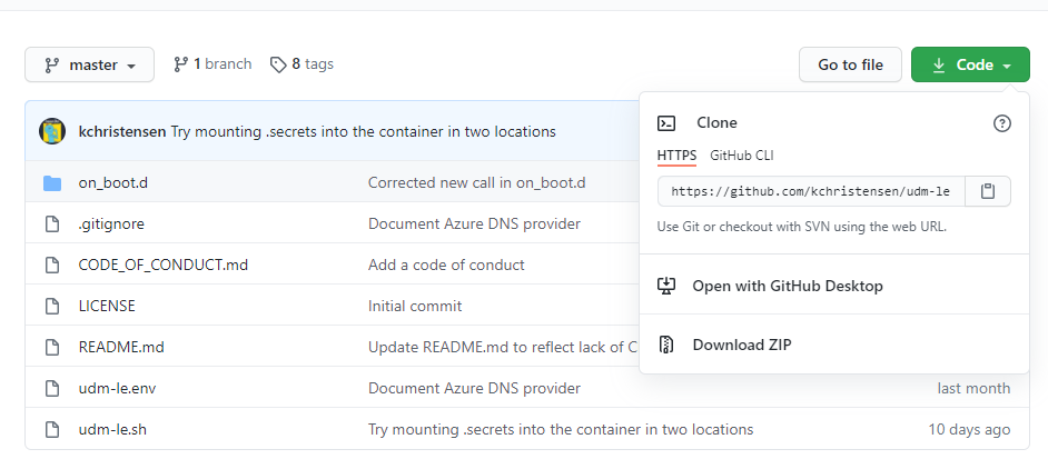 - Firstly download the code from the GitHub repo (download the repository as a ZIP), https://github.com/kchristensen/udm-le, to the directy /mnt/data on the device.