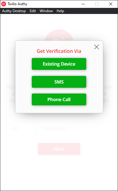 Use Existing Device and this will prompt you on the instance on your other device to allow access, you will also be required to ensure your backup password. If you have lost your device you will need use the other 2 options. You will then get a text/SMS which will then allow you to load your account: