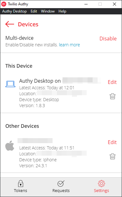 On this screen you can see which devices are active on your account as well as having the ability to remove that access. You can also restrict access to a single device (via the Multi-device option). Authy also allows you to set a pin number, as well as use your device's biometrics to restrict access to the app, which is a way to further strengthen the security of your TOTP codes.