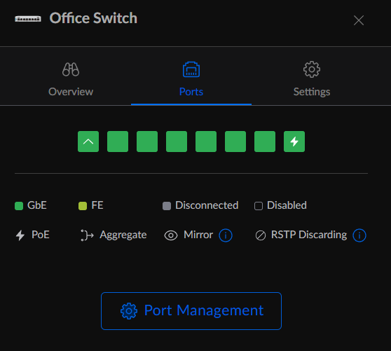 Select the switch that you wish to edit, then select the Ports tab and click on the Port Management button: