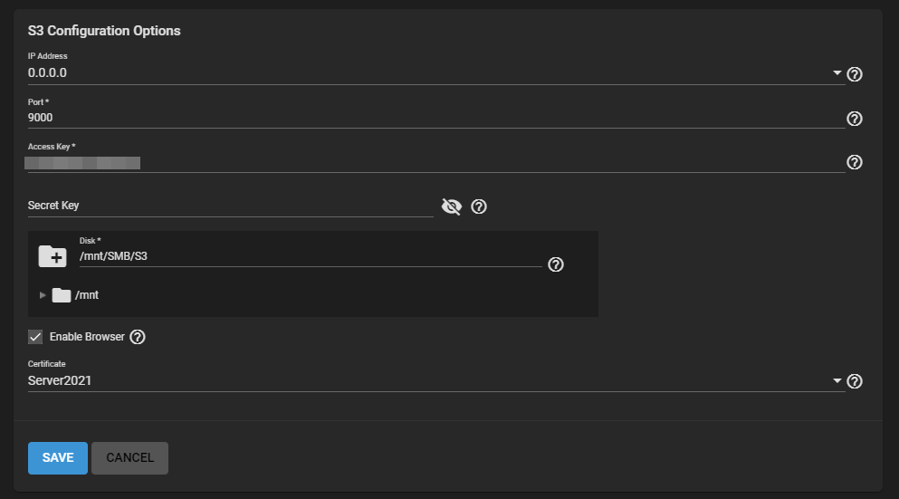 Next is set an Access Key and Secret Key. The Access Key needs to be a 20 character alphanumeric string. The Secret Key should be a sufficiently long alphanumeric string as well (at least 20 characters long, but the longer the better). Keep both safe and private, and make sure that they are randomly generated. Also select the mount point which you would like to use to store the data for your S3 bucket. Check the option Enable Browser if you would like to enable the MinIO Browser which will allow you to view your S3 buckets in a browser. Finally select the server certificate which will be used on your S3 service (this will typically be the same certificate which you use for the FreeNAS web interface).