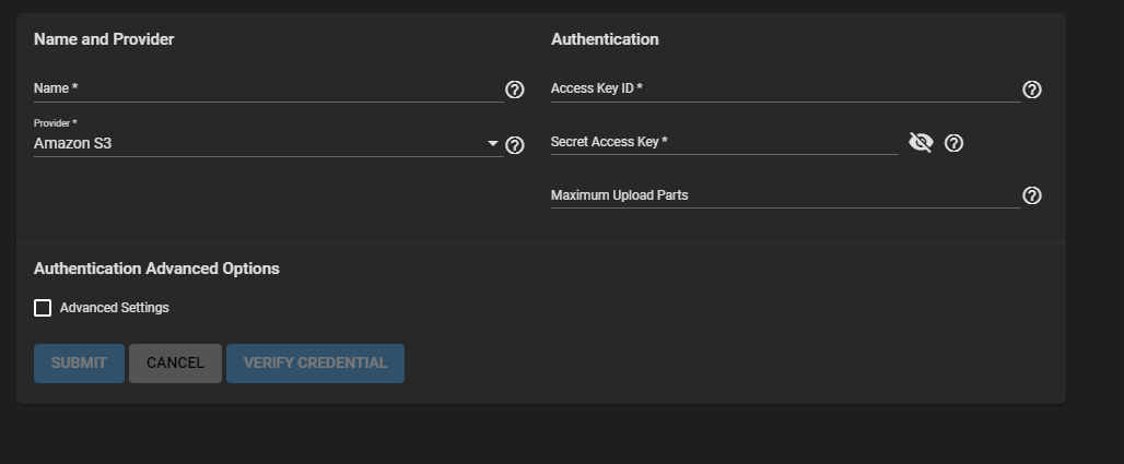 - Finally add the Access Key and Secret Key to be the same as what you set above when you configure the S3 service on the backup instance