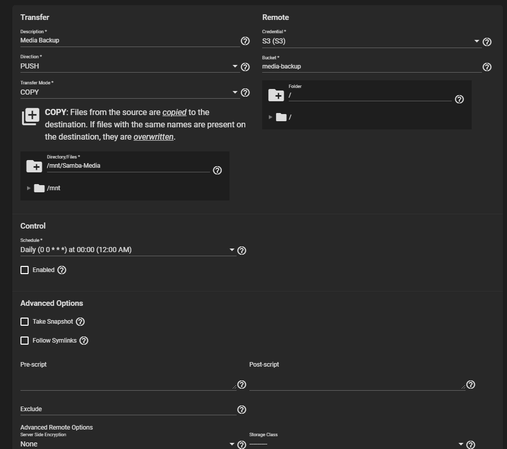 So far all great! Well until the Samba pool on my FreeNAS instance had some corrupted metadata. That was great! Well thankfully since I was running my FreeNAS instance within a VM, I restored a snapshot and I managed to get most of my data back. Now I hadn't backed this up before since the data is still available to me in some shape or form. But I don't want to go through the hassle of trying to correlate all this data should I have a similar issue again. So I decided to look at my backup options: