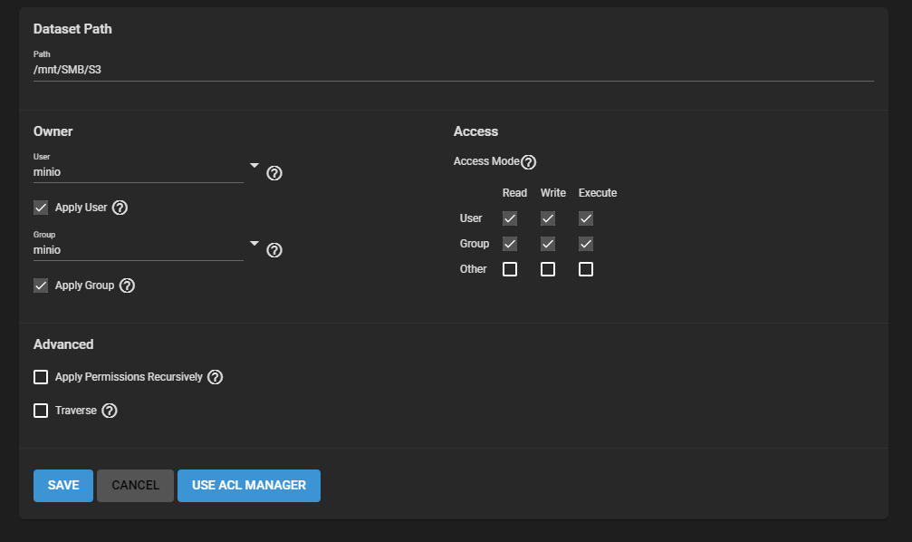 - The set the owner to minio and group to minio. Also make sure that both the owner an group have read and write access. Make sure that you also check the Apply User and Apply Group checkboxes. Click on the Save button to allow the changes to take affect